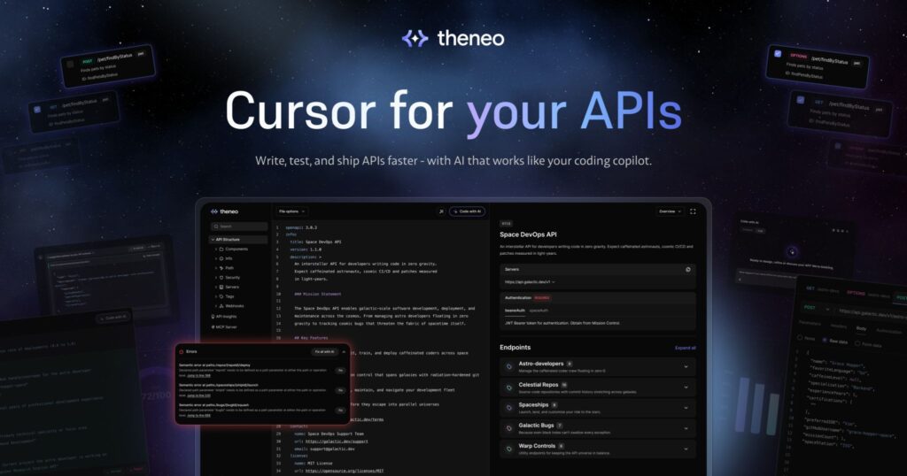 API docs startup Theneo has moved beyond documentation to launching an AI-powered API editor they’re calling “Cursor for your APIs.” Founded by Ana Robakidze the company has already helped 15,000+ teams generate developer docs, but saw engineers juggling too many tools to edit, validate and test OpenAPI specs. The new editor combines design, linting, doc previews, and test requests in a single lightweight tab — with AI‑assisted edits always gated by a diff. Everything runs client-side, with support for Gemini, Claude, or ChatGPT keys. Next up: deeper MCP testing and repo integrations. No signup, free to try.