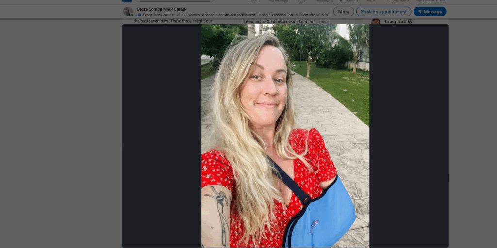Three weeks ago, Becca Combe MIRP CertRP was happily sourcing candidates from a hammock in the Caribbean… right up until the hook gave way, she hit the floor, severed a vein, and her MacBook screen exploded. Multiple hospital trips, a wrecked laptop, and trying to recruit left‑handed with an injured left arm later, she’s still here matching people with jobs in devtools companies and keeping Develocity moving.